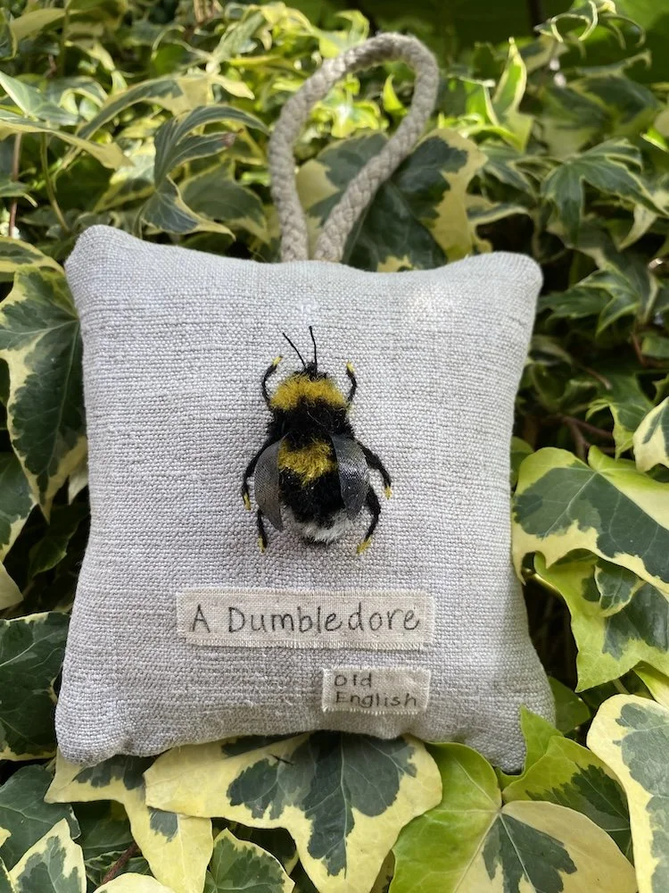 A Dumbledore, the old English word for a Bumblebee. Filled with lavender and camomile with a black and white wool back.