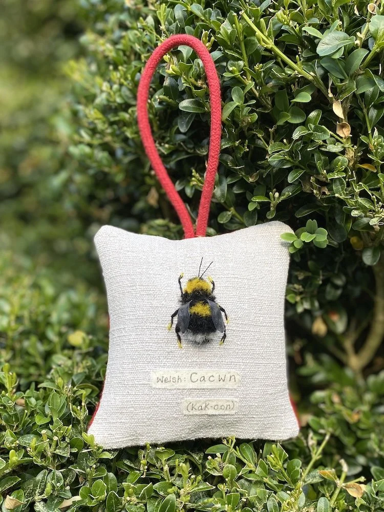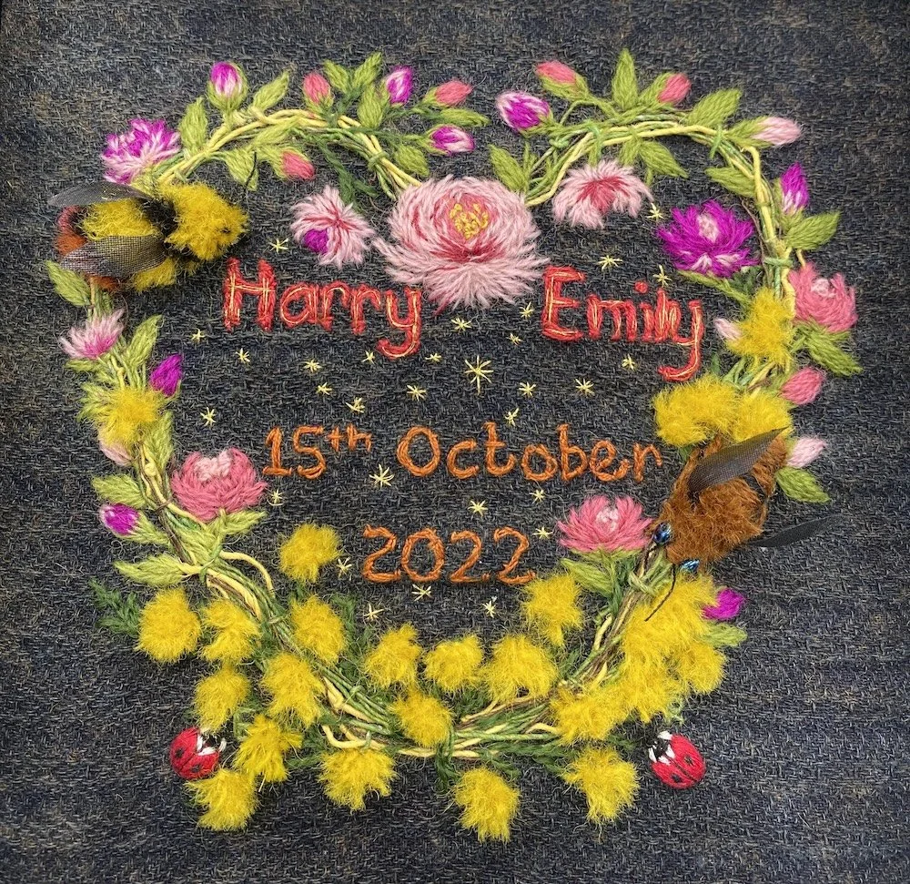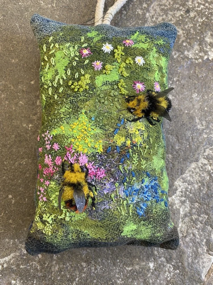 My background in Environmental Science means I see embroidery not just as decoration, but as a way to gently teach and celebrate what we still have: bees, dandelions, hover-flies, hedgerows. Every piece I make is rooted in real species, drawn from field guides and nature, sketched freehand with an erasable pen, my Bernina sewing machine or by hand with a needle and thread.