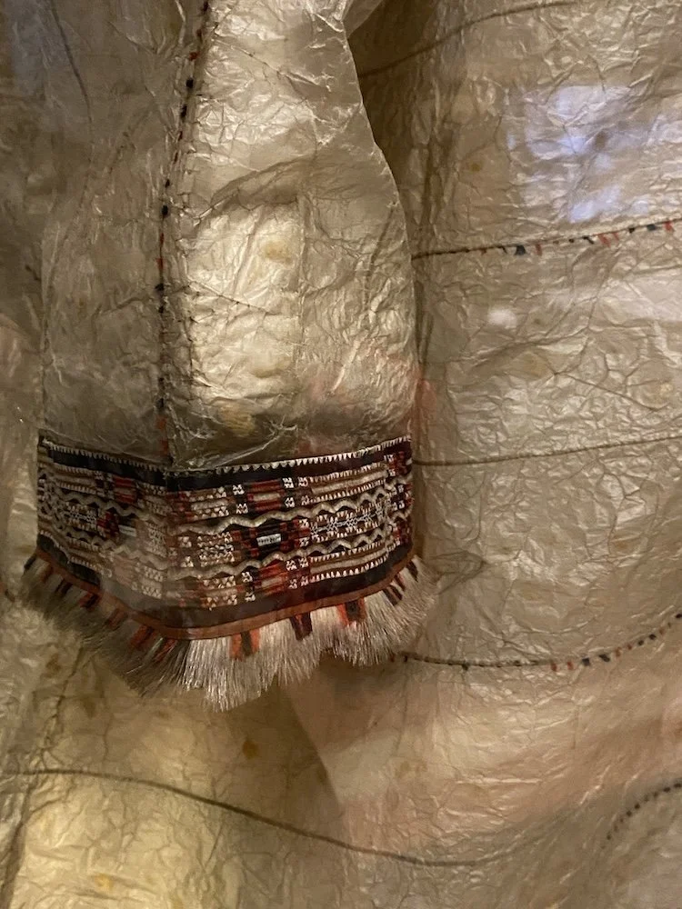 The cuffs and hem of the parka feature a complex border of fourteen thin bands of parchment-like sealskin dyed red and black. These are over woven with fine caribou-hair embroidery in geometric patterns. There are more than 20,000 embroidery stitches in the border alone.