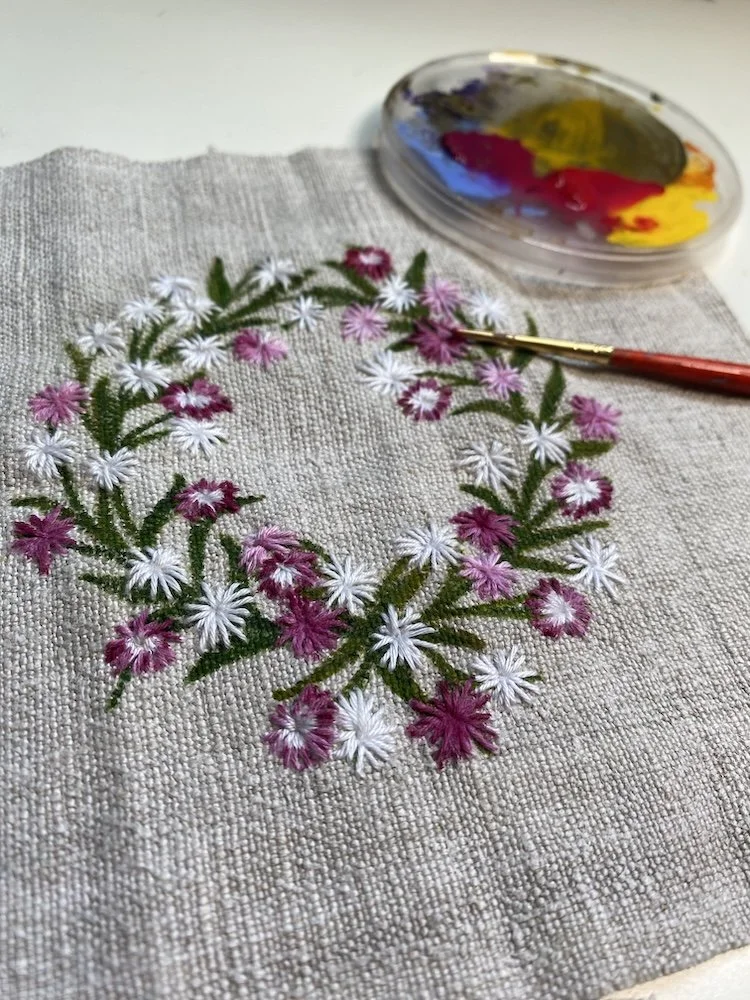 Working on a new technique by gelli printing onto the linen with leaves and flowers and then hand painting to pick out some details.
